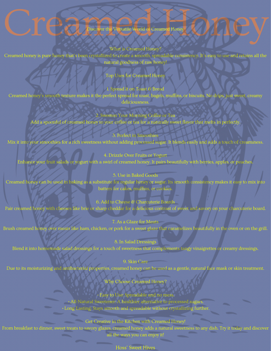 Indulge in the luxurious texture and rich flavor of our Creamed Honey. Expertly crafted to achieve a smooth, spreadable consistency, our creamed honey is a delightful twist on traditional honey. Its velvety texture and naturally sweet taste make it perfect for spreading on toast, mixing into oatmeal, or adding a touch of elegance to your favorite recipes.